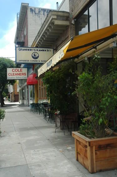 Thanks to great directions from the friendly Alamo exit gate guy, I sped off toward downtown San Fran and soon found myself facing Golden Gate Park. I snaked my way east, in search of the restaurant called Zazie that was my lunch destination. My search took me through the Haight-Ashbury neighborhood; I made a mental note to return for a longer look around, as it seems to be right up my alley (no pun intended). Here's a picture from Haight: