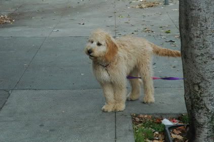 The place was small, with exposed brick walls, wooden tables and chairs as well as booth seating (I did not try the outdoor patio, but it would be a nice place to while away an afternoon) and a loft office reached by a slender and curling iron staircase. I settled in comfortably and was warmly greeted by a nice waitress. My breakfast consisted of a large and excellent bowl of cafe latte, paired with a lovely omelette that contained warm sausage and the freshest of tomatoes. The potatoes accompanying my omelette were convincingly "garlic roasted," as the browned garlic pieces were actually served with the potatoes. Feeling sated, I paid the bill (also learning from a note that accompanied the bill that the waitress was giving all of her tips to the week to benefit victims of Hurricane Katrina) and ventured back into the world, but not before greeting a friendly dog tethered to a tree outside: