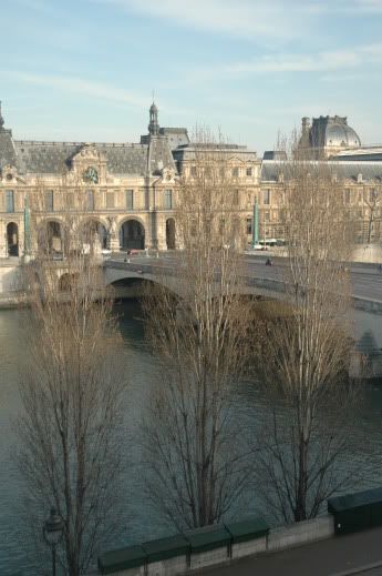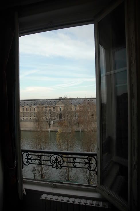 Yep, that's the Louvre Museum, just on the other side of the Seine. Beautiful, isn't it? I knew I had done the right thing in coming to Paris when I gazed at this sight through the open window and felt the cool air on my face while being warmed from below by the room's tiny radiator. I took a few minutes to relax and freshen up, then emerged from the hotel under a bright blue Paris sky to enjoy Christmas Eve, which I will write about when I return: